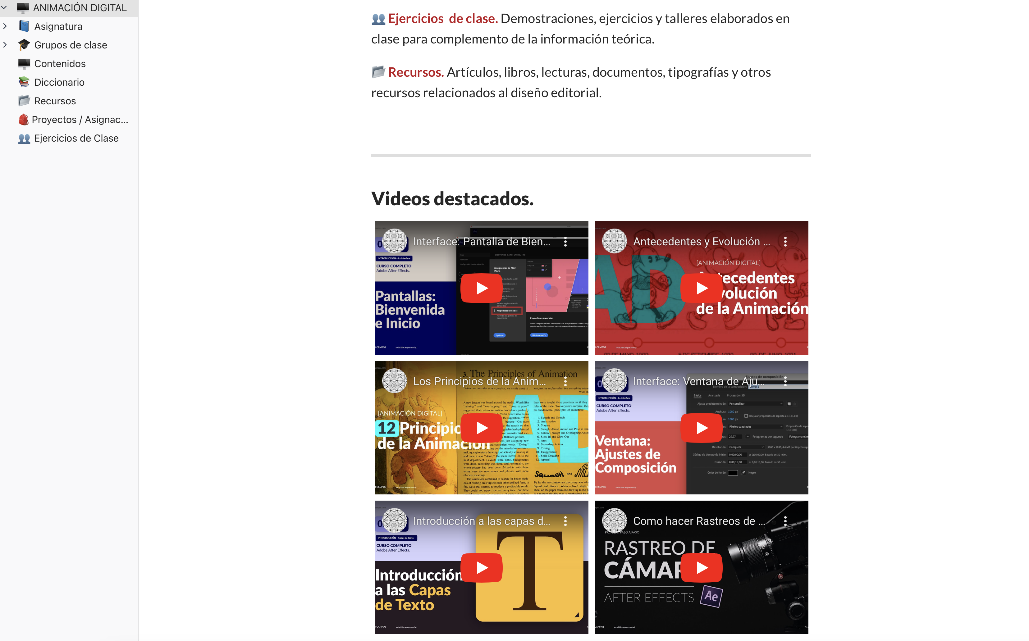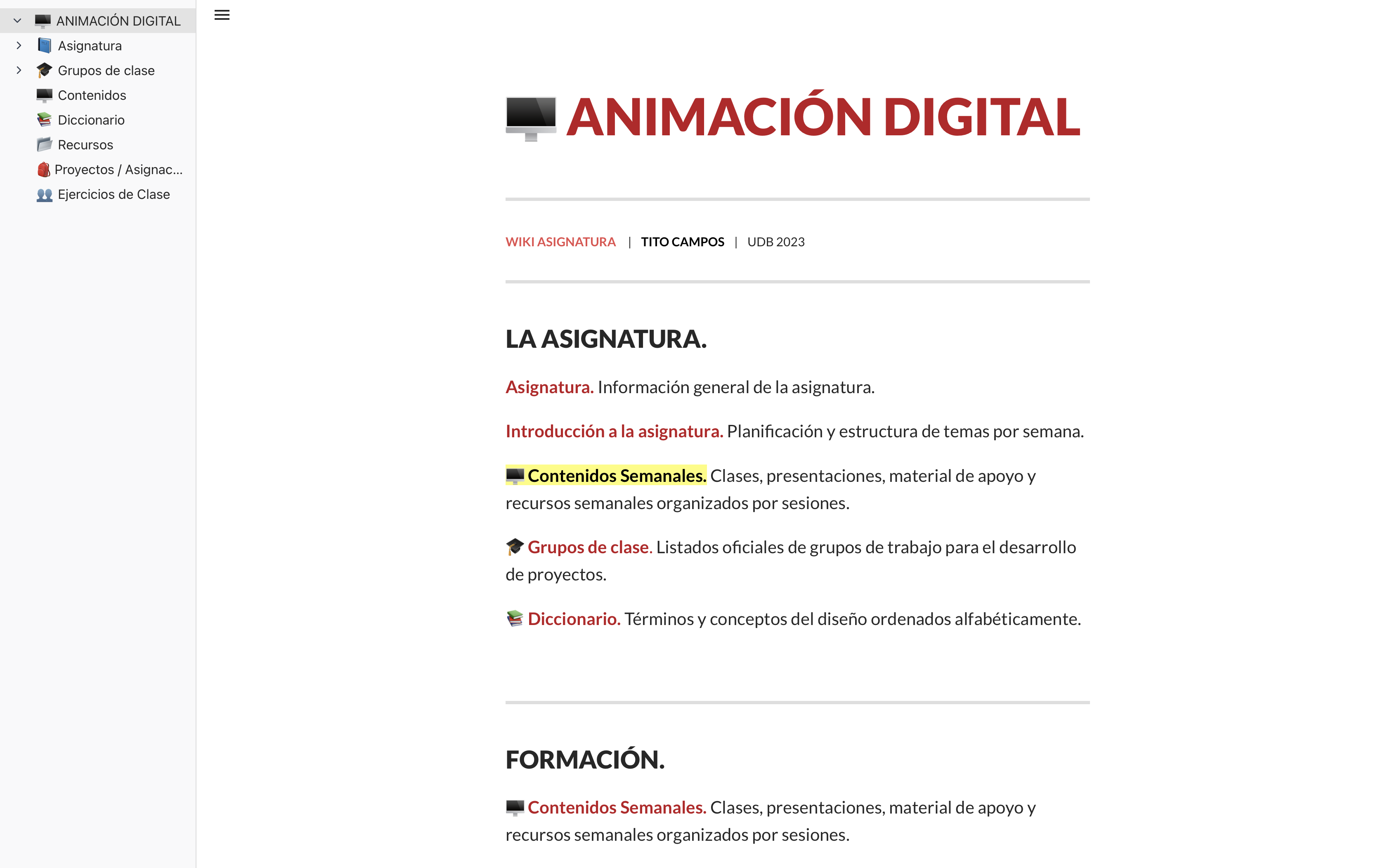 Visite la wiki de la asignatura para ver todo el contenido relacionado a la asignatura, material de soporte, definiciones y otro contenido teórico-textual importante para el desarrollo de la asignatura y aprendizaje de la animación digital.