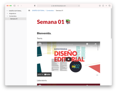 Visite la wiki de la asignatura para ver todo el contenido relacionado a la asignatura, material de soporte, definiciones y otro contenido teórico-textual importante para el desarrollo de la asignatura y aprendizaje del diseño editorial.
